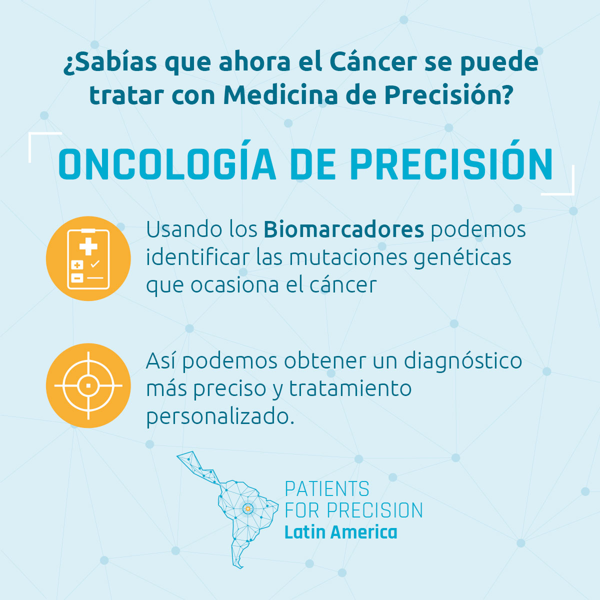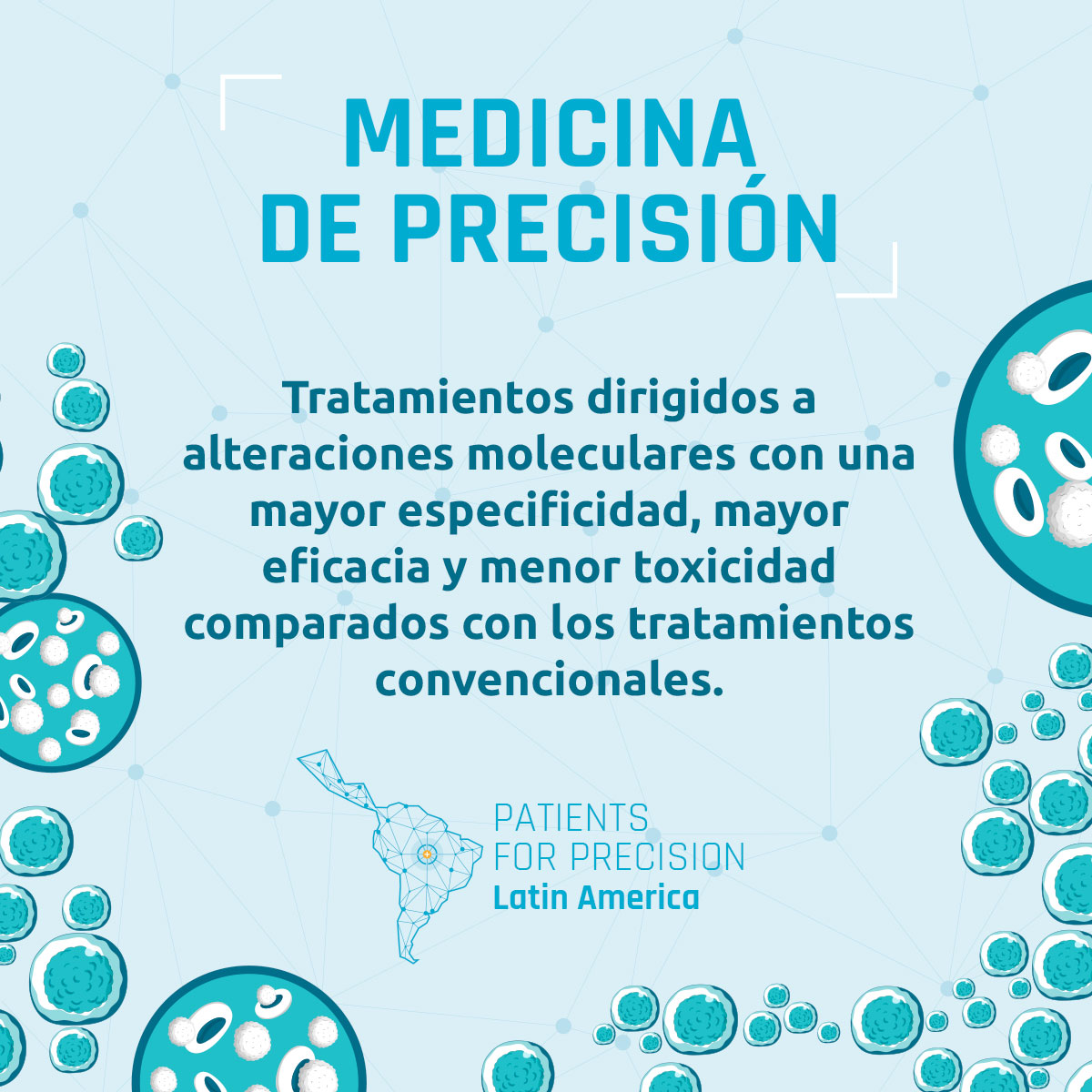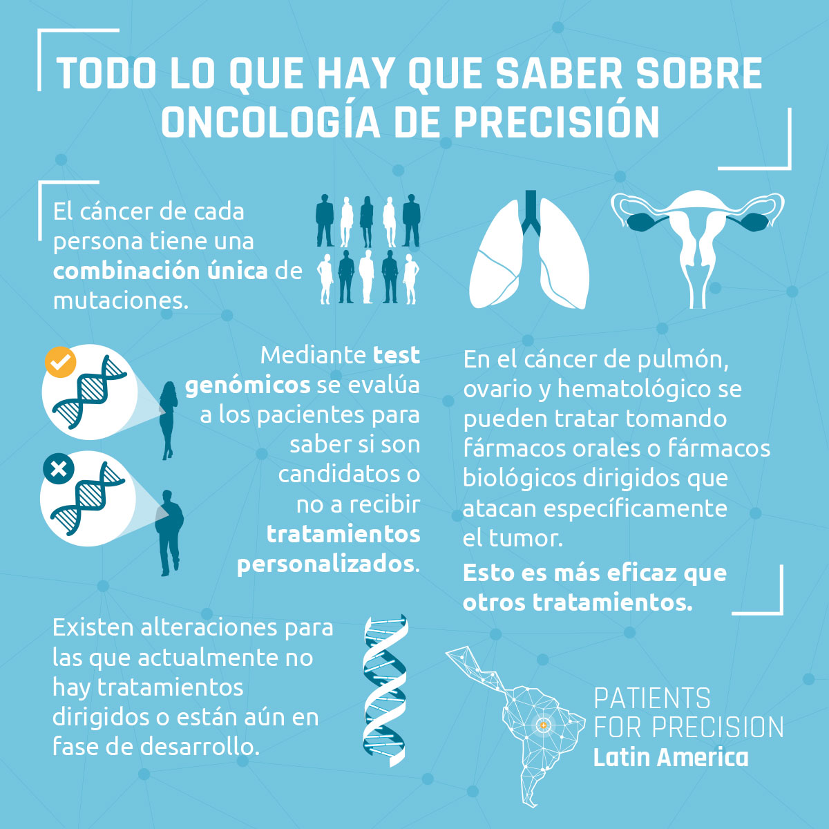 Patients for Precision es una red de organizaciones de apoyo a los pacientes de cáncer con sede en América Latina que trabajan por el avance de la oncología de precisión en esta región. Existe una mayor necesidad en los sistemas de salud del sector público, que es donde se atiende a la mayoría de los pacientes. Esta página web explica el porqué es importante, y hace un llamado para que los países de la región estén más preparados en cuanto a la medicina de precisión; además, proporciona información sobre los avances y desafíos de la oncología de precisión, propone una serie de preguntas para un mayor debate, y examina los desafíos y oportunidades en varios países de América Latina.