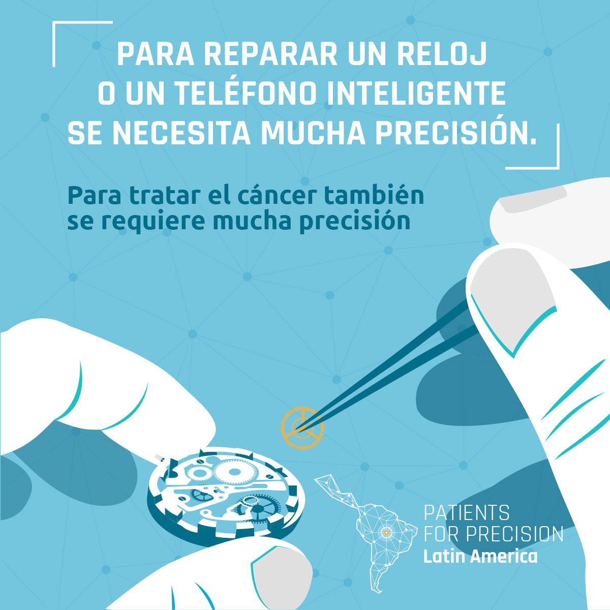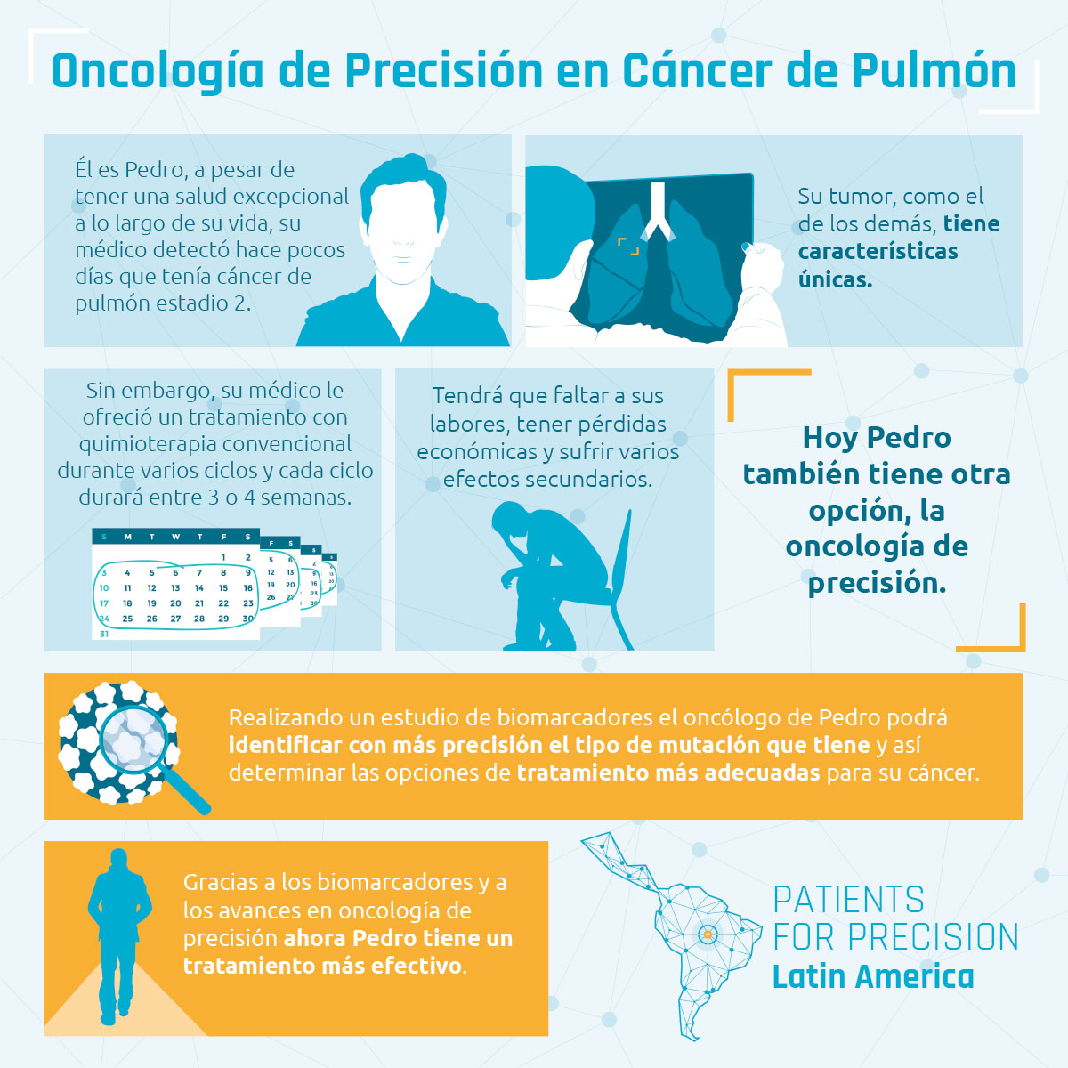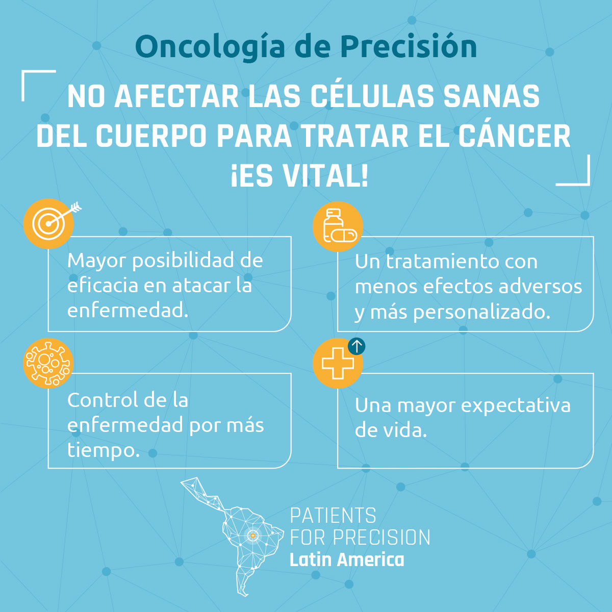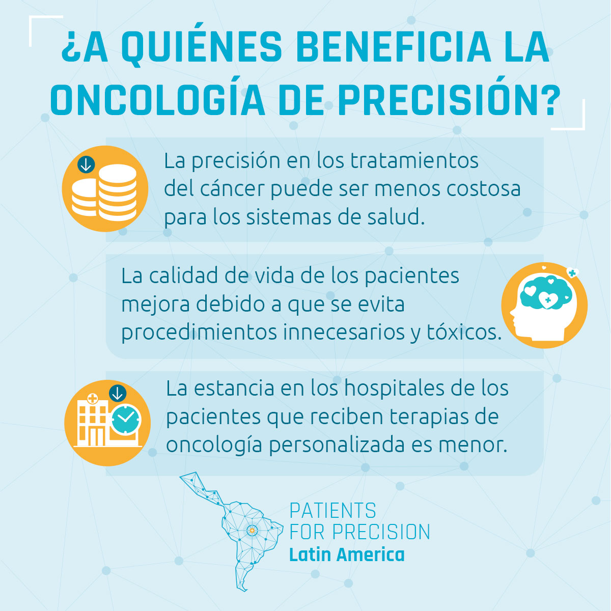 Patients for Precision es una red de organizaciones de apoyo a los pacientes de cáncer con sede en América Latina que trabajan por el avance de la oncología de precisión en esta región. Existe una mayor necesidad en los sistemas de salud del sector público, que es donde se atiende a la mayoría de los pacientes. Esta página web explica el porqué es importante, y hace un llamado para que los países de la región estén más preparados en cuanto a la medicina de precisión; además, proporciona información sobre los avances y desafíos de la oncología de precisión, propone una serie de preguntas para un mayor debate, y examina los desafíos y oportunidades en varios países de América Latina.
